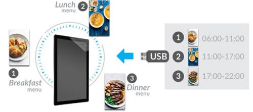 Deze software maakt het mogelijk om verschillende beeldinhoud op bepaalde tijden van de dag weer te geven, voor een restau- rant zou u bijvoorbeeld ontbijtmenu’s kunnen weergeven in de ochtend, lunchmenu’s in de namiddag en diner menu’s in de avond. U kunt ook de beeldduur, overgangen en effecten instellen met behulp van deze software.